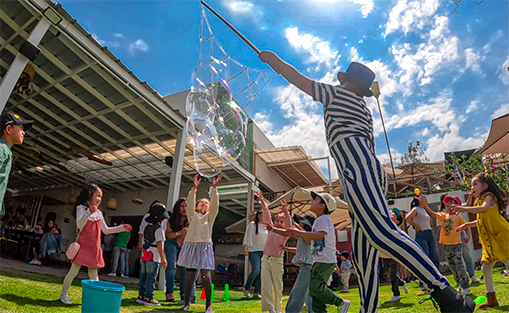 Si es cumpleaños, suele ser ideal el Show de Circo Infantil. Si buscas impacto visual, Burbujas + Zancos. Para instituciones, Colegios.